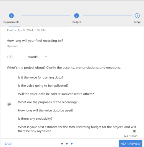 • Future sub-licensing and transferable rights regarding AI projects must be made clear to the voice actor and included in the ‘What’s the project about’ section.